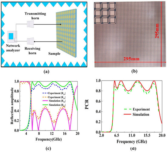 (a) Schematic diagram of the experimental testing setup, (b) the experiment sample, comparison between simulated and experimental results, (c) co-polarized and cross-polarized , (d) PCR.