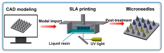 According to the different types of application requirements, microneedles are generally categorized into four types, namely solid, hollow, coated, and dissolvable microneedles [10]. Ultimately, the selection of these strategies is determined by the application’s design constraints, which encompass dosing needs, kinetics, and stability. To date, a broad range of production methods have been employed to fabricate needles with microscale structures, such as lithography and etching, electroplating, laser cutting, and micromolding [11,12]. However, existing microneedle fabrication techniques largely depend on indirect micromolding. Because these methods necessitate a multitude of time-consuming and cumbersome steps, they ultimately lengthen the time needed to develop new designs and result in resource waste. Although numerous studies have demonstrated successful applications [13,14,15], these types of methods have technical limitations that prevent certain types of microneedles from being produced, such as porous, large, or channel structures.
