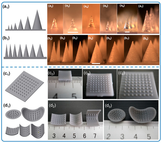 Solid microneedles with different scales (a1–a7), (a1) 3D model, (a2–a7) optical images of microneedles: (a2) 0.25 × 0.65 mm, (a3) 0.3 × 0.8 mm, (a4) 0.5 × 1.2 mm, (a5) 0.8 × 1.6 mm, (a6) 1 × 2 mm, (a7) 1.5 × 3 mm (Φ × h) (scale bar = 500 µm). Solid microneedles with different tip angles (b1–b8), (b1) 3D model, (b2–b8) optical images of MNs: (b2) 1 × 3 mm, (b3) 1.2 × 3 mm, (b4) 1.5 × 3 mm, (b5) 1.8 × 3 mm, (b6) 2 × 3 mm, (b7) 2.2 × 3 mm, (b8) 2.5 × 3 mm (Φ × h) (scale bar = 1 mm). Optical images of 3D-printed MNs, (c1) 3D model of large arrays, (c2,c3) 0.25 × 0.65 mm, (c4) 0.8 × 1.6 mm; (d1) 3D model of non-plane arrays; (d2) surface structure arrays, 0.8 × 1.6 mm; (d3) sphere structure arrays, 0.8 × 1.6 mm (Φ × h).