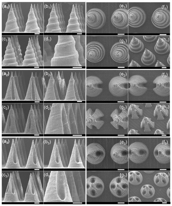 SEM images of microneedles with groove structures. (a1–h1) Three types of spiral groove microneedles, (a1–d1) front view, (e1–h1) top view; (a2–h2) three types of cambered groove microneedles, (a2–d2) front view, (e2–h2) top view; (a3–h3) three types of hollow hole microneedles, (a3–d3) front view, (e3–h3) top view (scale bar = 500 μm).