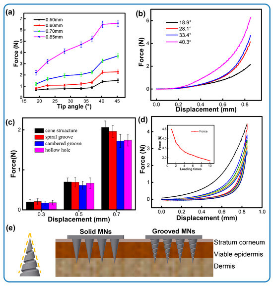 Insertion forces of microneedles. (a) Different tip angles within insertion depths, (b) the force process under different tip angles, (c) channel structures within insertion depths, (d) cycle loading of conical microneedles, (e) the contours of spiral groove microneedles and a schematic illustration of the penetration of the skin with different types of microneedles.