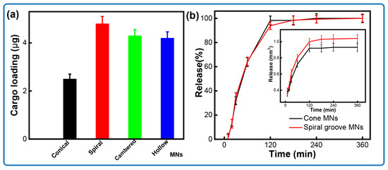 Figure 5a compares the drug loading capacities of the conical and grooved microneedles. Microneedles incorporating the designed structures show a significant increase in loading capacity, improving by 108%—from 2.3 μg for conical structures to ~4.8 μg for hollow structures. Among all tested designs, the spiral groove microneedles exhibit the optimal drug loading, which is almost two times higher than that achieved by the cone arrays. We conjecture that this enhancement is due to the increased surface area afforded by the channel features, which facilitates the adhesion of more coating material. Specifically, the spiral structure not only extends the relative surface area but also impedes the flow of the coated loading, thereby improving retention. The microneedle arrays featuring cambered groove and hollow structures show similar results, likely due to their analogous structural features. Taking the spiral groove as an example, the structure leads to creating concaves on the surfaces of the microneedles. Additionally, the flexible design allows operators to obtain a larger amount of loading on demand.
