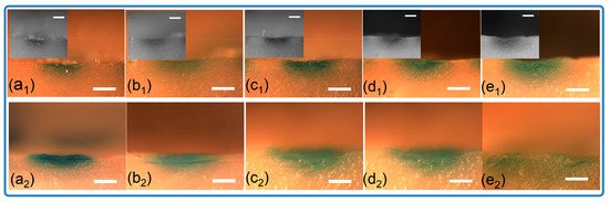 Optical images of cross-sections for porcine samples inserted with loaded microneedles. (a1–e1) Solid microneedles, (a1) 10 min, (b1) 20 min, (c1) 30 min, (d1) 1 h, (e1) 2 h; (a2–e2) grooved microneedles, (a2) 10 min, (b2) 20 min, (c2) 30 min, (d2) 1 h, (e2) 2 h (scale bar = 1 mm).