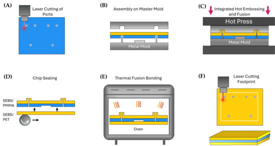 Fabrication process of a connection chip equipped with µGaskets. (A) Ports in the PMMA layer are laser cut before hot embossing. (B) Assembly of the laser cut PMMA layer and an SEBS layer in the metal master mold featuring the structures and pins for the microchannels and µGaskets. (C) Simultaneous microstructure patterning and thermal fusion bonding of the layers in a hot press. (D) Sealing of the hot embossed hybrid layer by lamination of another SEBS layer. (E) Thermal fusion bonding of the layers in an oven at 67 °C. (F) Laser cutting of the chip footprint.