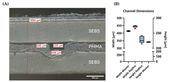 The optimized two-sided hot embossing process achieved highly accurate features in both materials, namely the SEBS µGasket layer and the PMMA channel layer (Figure 3 and Figure 4). Side cuts of the hybrid modules demonstrated channel replica in PMMA with a height of 228 ± 11 µm (n = 12) and width of 442 ± 7.6 µm (n = 9). Master mold channel structures featured heights of 221 ± 2.1 µm (n = 2) and widths of 413 ± 5.7 µm (n = 2, Figure 3). The results confirm a structural transfer of approx. 96% and 93% accuracy.