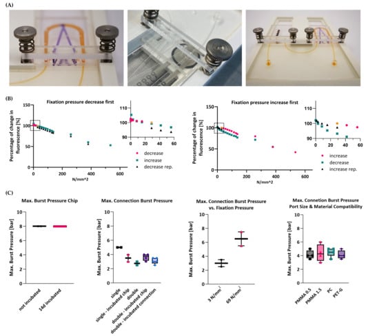 The strength of the overall system integrity of the connection chip was characterized by measuring the maximum burst pressure using pressurized air. Tests were conducted both with and without incubation at 37 °C and 95% humidity for 14 days, reproducing cell culture conditions used in OoC applications (Figure 5C). For both conditions, the chips were able to endure pressures of at least 8 bar, which is magnitudes higher than typical pressures during OoC experiments (in the range of a few hundred millibars []).