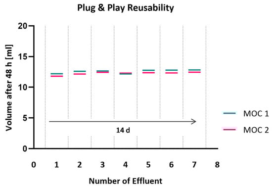 Functionality of the reversible plug and play characteristic of the µGasket concept was confirmed by repeated detachment and reconnection of chip modules to the platform. Re-plugging of the organ chips via the µGaskets every second day did not show any leakage or wearing of the connection site (Figure 6). Tightness was shown for seven detachment cycles over 14 days under perfusion. Effluent collection verified completely tight chip-to-chip reconnections with a consistent flow in the system. Constant volumes of ~12.5 mL were collected after 48 h for platforms hosting two connected organ chips. Small variations in ±0.27 mL for MOC 1 and ±0.23 mL for MOC 2 are ascribable to errors of measurement of the weighted effluent.
