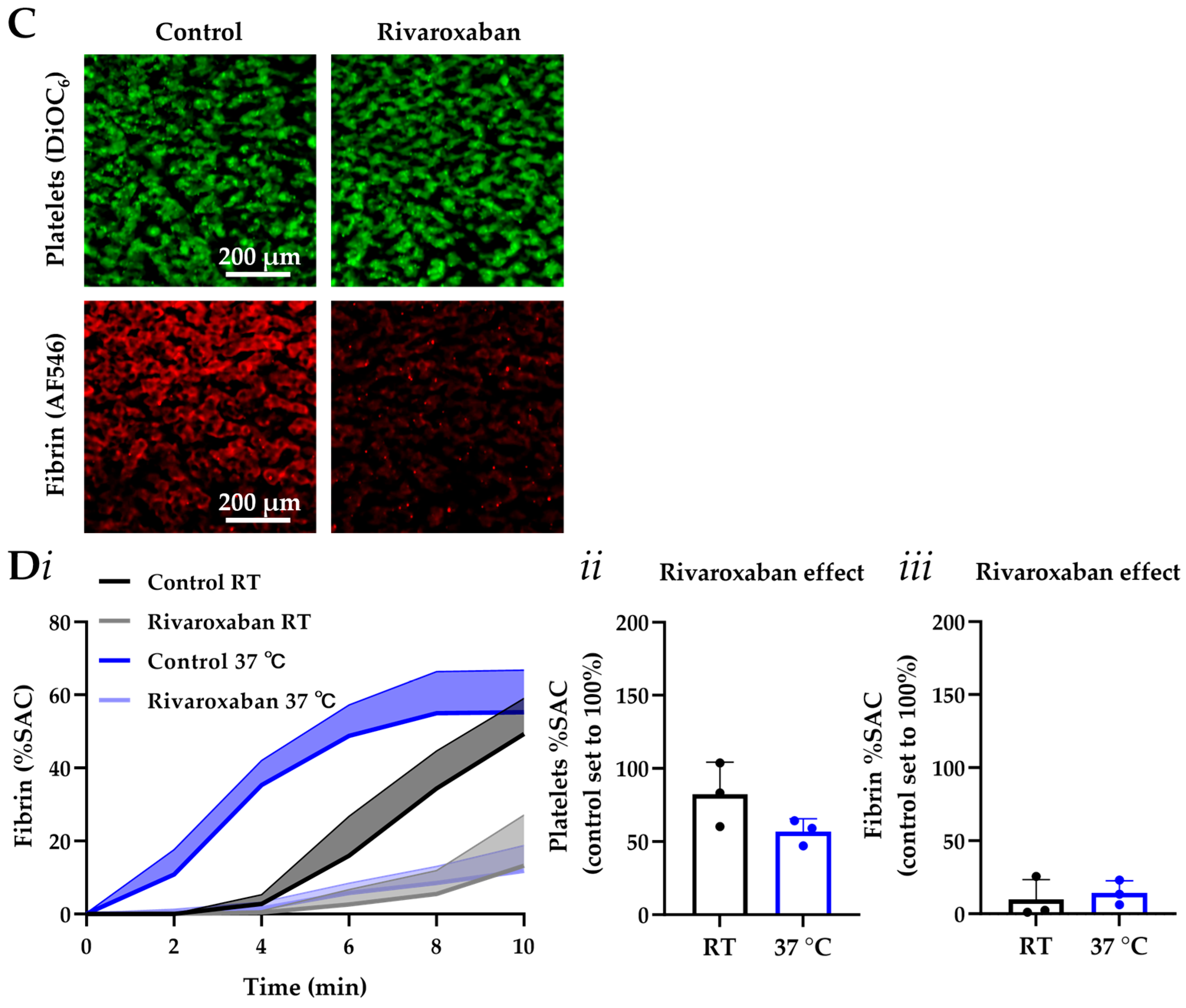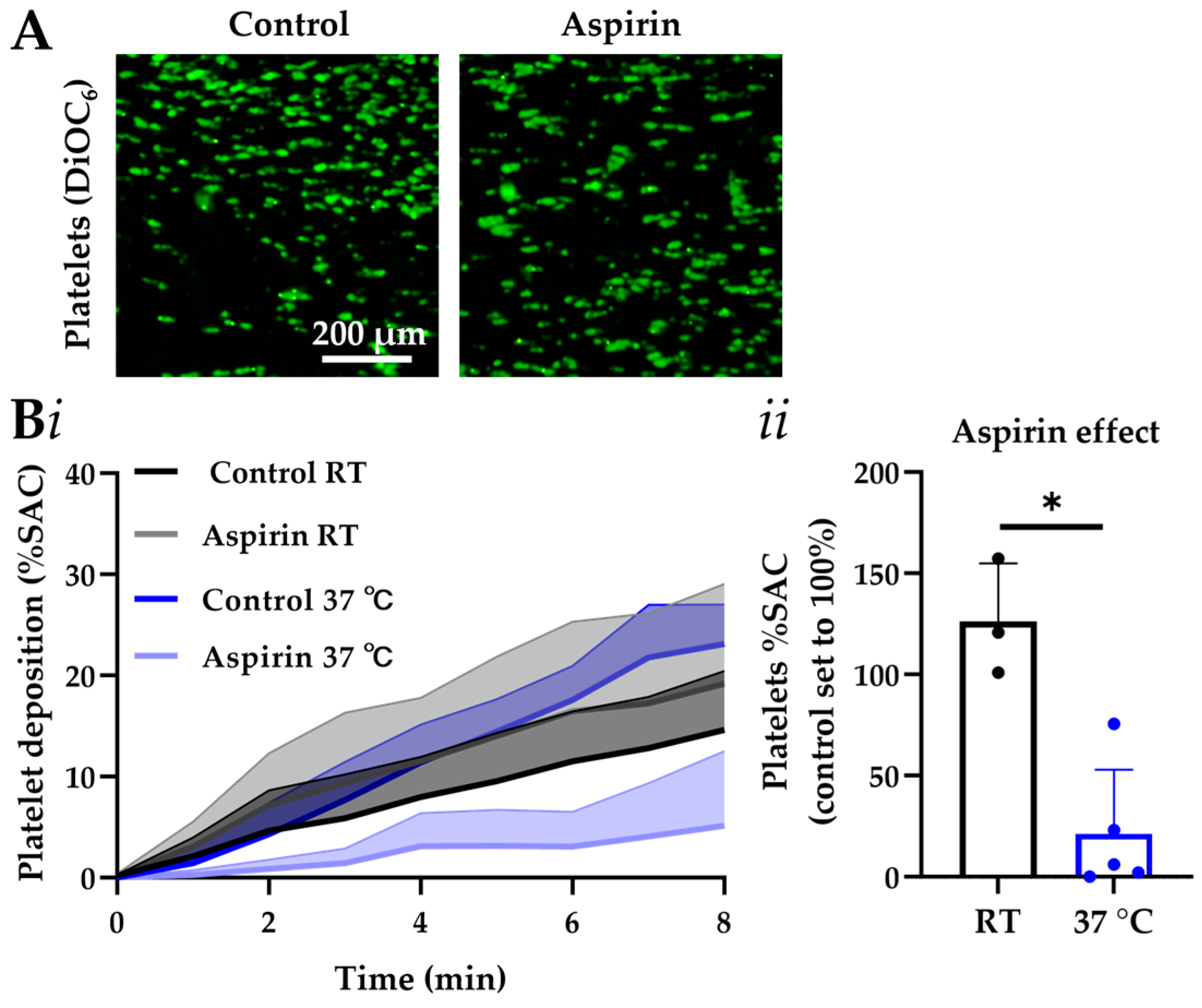 - Herfs, L.; Swieringa, F.; Jooss, N.; Kozlowski, M.; Heubel-Moenen, F.C.; van Oerle, R.; Machiels, P.; Henskens, Y.; Heemskerk, J.W. Multiparameter microfluidics assay of thrombus formation reveals increased sensitivity to contraction and antiplatelet agents at physiological temperature. Thromb. Res. 2021, 203, 46–56. [Google Scholar] [CrossRef]