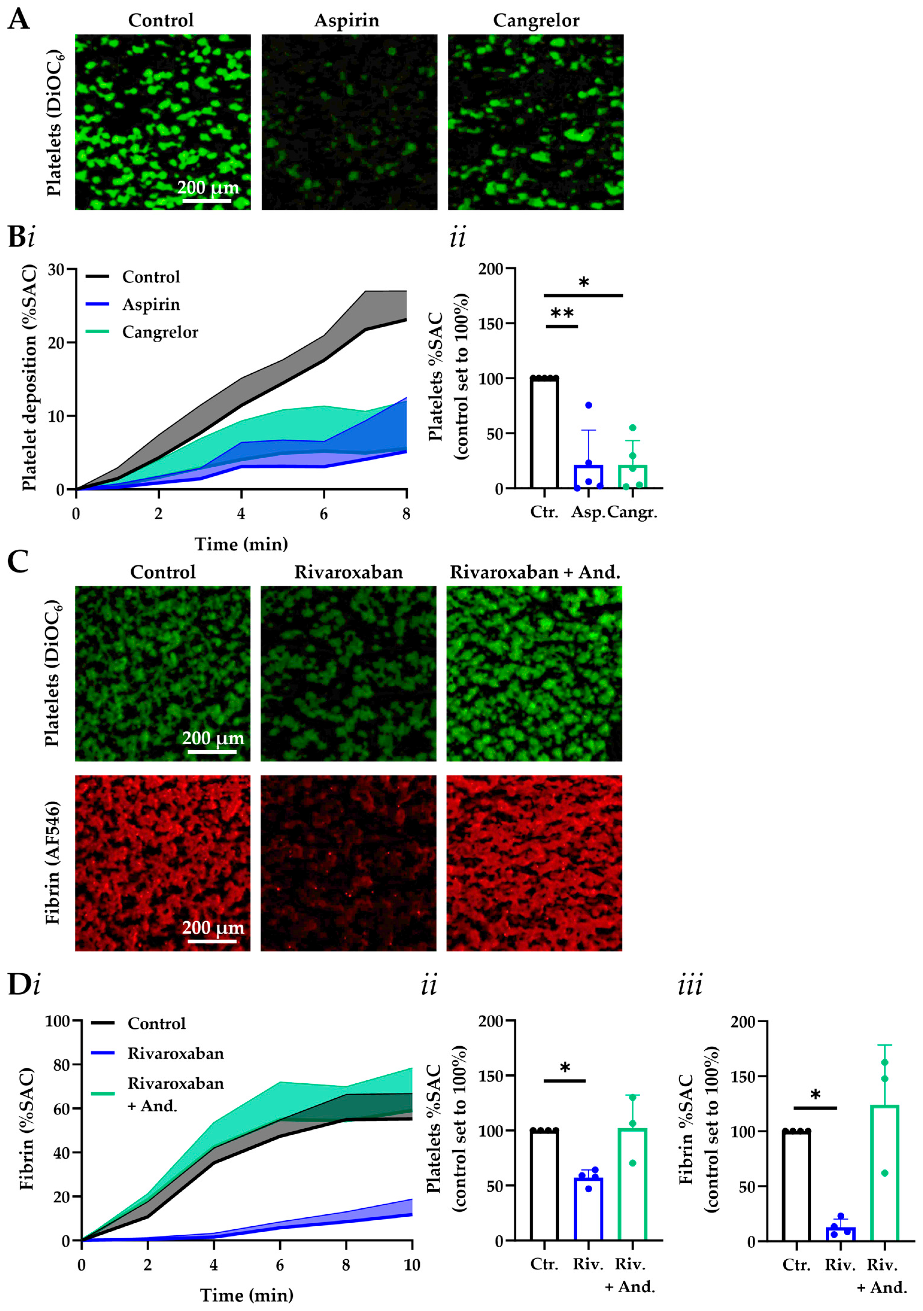 - Borst, O.; Münzer, P.; Alnaggar, N.; Geue, S.; Tegtmeyer, R.; Rath, D.; Droppa, M.; Seizer, P.; Heitmeier, S.; Heemskerk, J.W.; et al. Inhibitory mechanisms of very low-dose rivaroxaban in non-ST-elevation myocardial infarction. Blood Adv. 2018, 2, 715–730. [Google Scholar] [CrossRef]