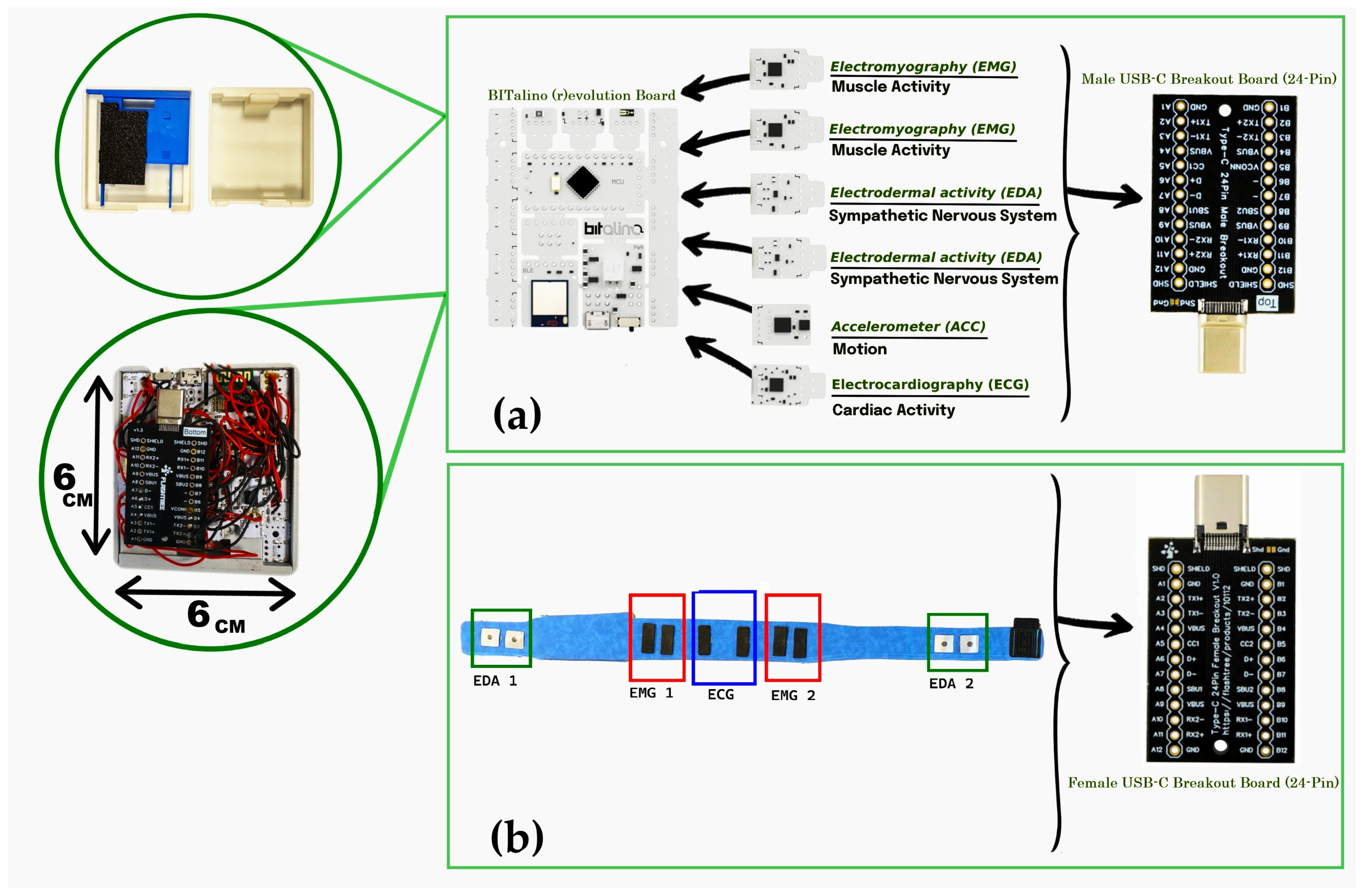 27]. To achieve a compact layout suitable for wearable integration, the original female sockets on the board were removed. Sensor leads were then securely soldered directly to the board, ensuring robust electrical connections and minimizing spatial constraints. An identical customization approach was applied to the wristband, which used a smaller BITalino Mini board configured for a single EDA channel acquisition. The internal electronic layout of the belt, including the BITalino (r)evolution board, custom sensors, and USB Type-C interface, is shown in