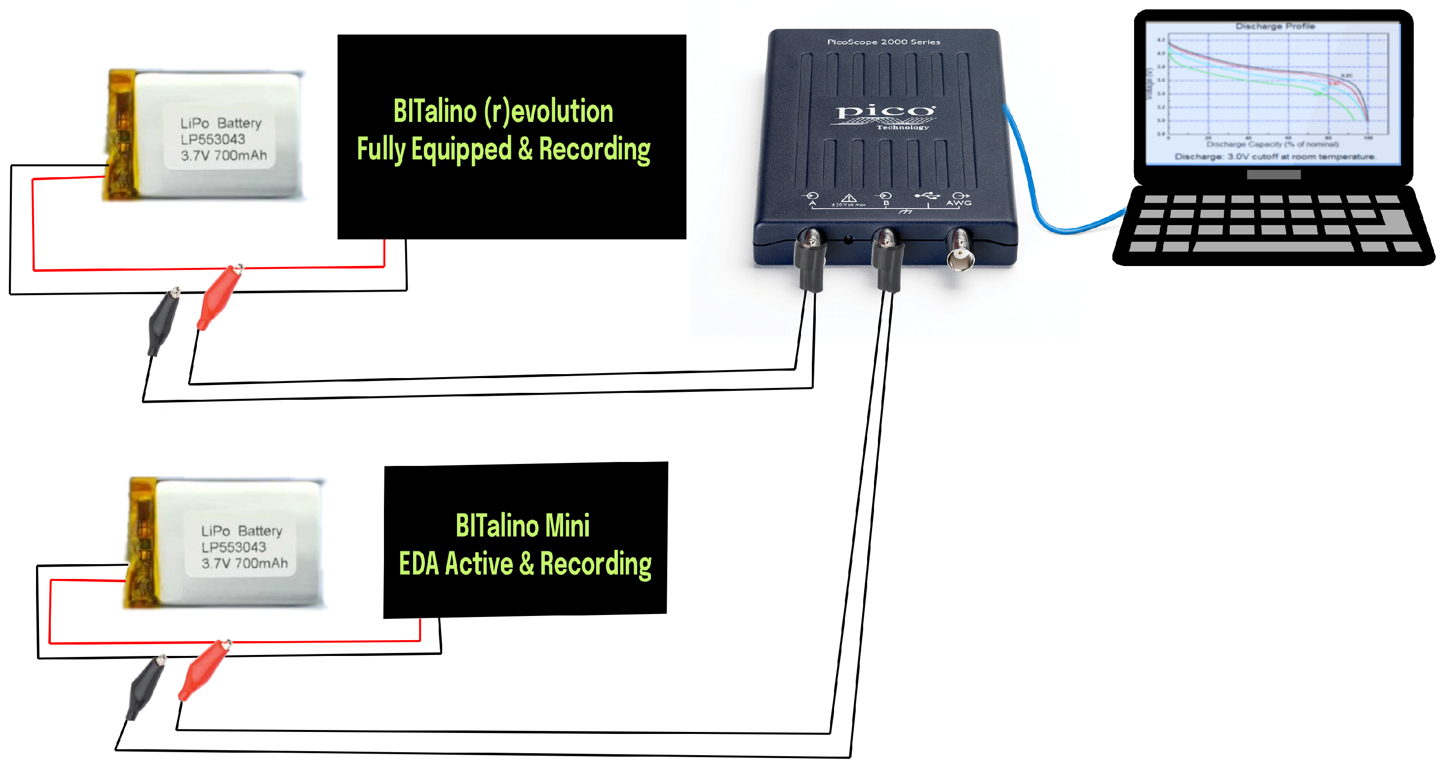 32]. The voltage monitoring was conducted noninvasively by probing the battery terminal voltage while the system was operating under full load, with Channel A of the PicoScope connected across the terminals of the YDL 3.7V 700mAh 603035 rechargeable and replaceable lithium-polymer battery, using standard oscilloscope probes with the ground clip attached to the battery’s negative terminal and the signal tip connected to the positive terminal. The PicoScope was configured in DC-coupled mode to ensure accurate tracking of voltage drop. During the test, the wearable belt system was fully active with all biosignal channels enabled, including two EDA, one ECG, two EMG, and one ACC, alongside continuous Bluetooth streaming, and the system remained operational until automatic shutdown occurred due to voltage decay below the BITalino board’s cutoff threshold, typically around 3.3 V. The PicoScope 2000 setup for battery runtime monitoring is shown in