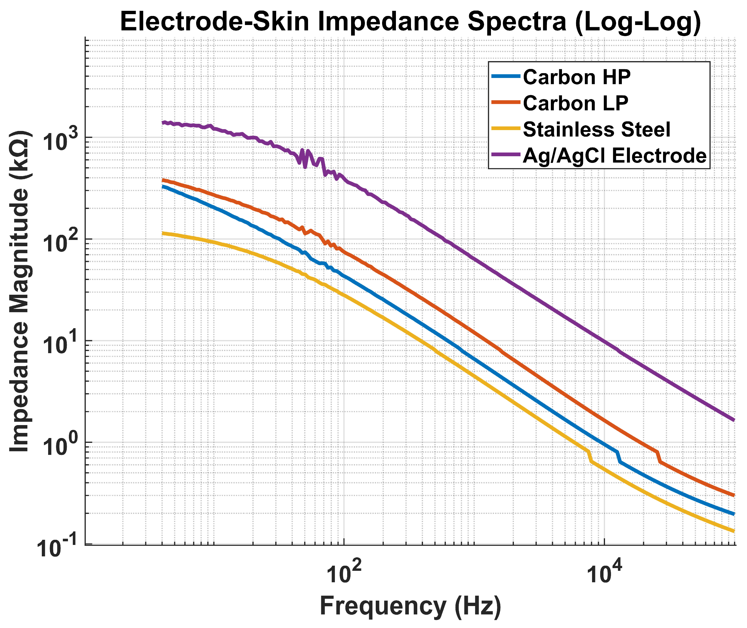 Measurements were performed in a two-electrode configuration under controlled skin preparation and contact pressure conditions to minimize variability. Each electrode was tested on hydrated skin to mimic real-world conditions encountered during wearable operation. The impedance analyzer applied a low-amplitude sinusoidal excitation signal, and both the real and imaginary components of impedance were recorded to compute magnitude and phase across the tested frequencies. The resulting impedance spectra were plotted to visualize frequency-dependent characteristics and to compare the performance of different electrode types, including CB–PDMS, stainless steel, and Ag/AgCl electrodes.