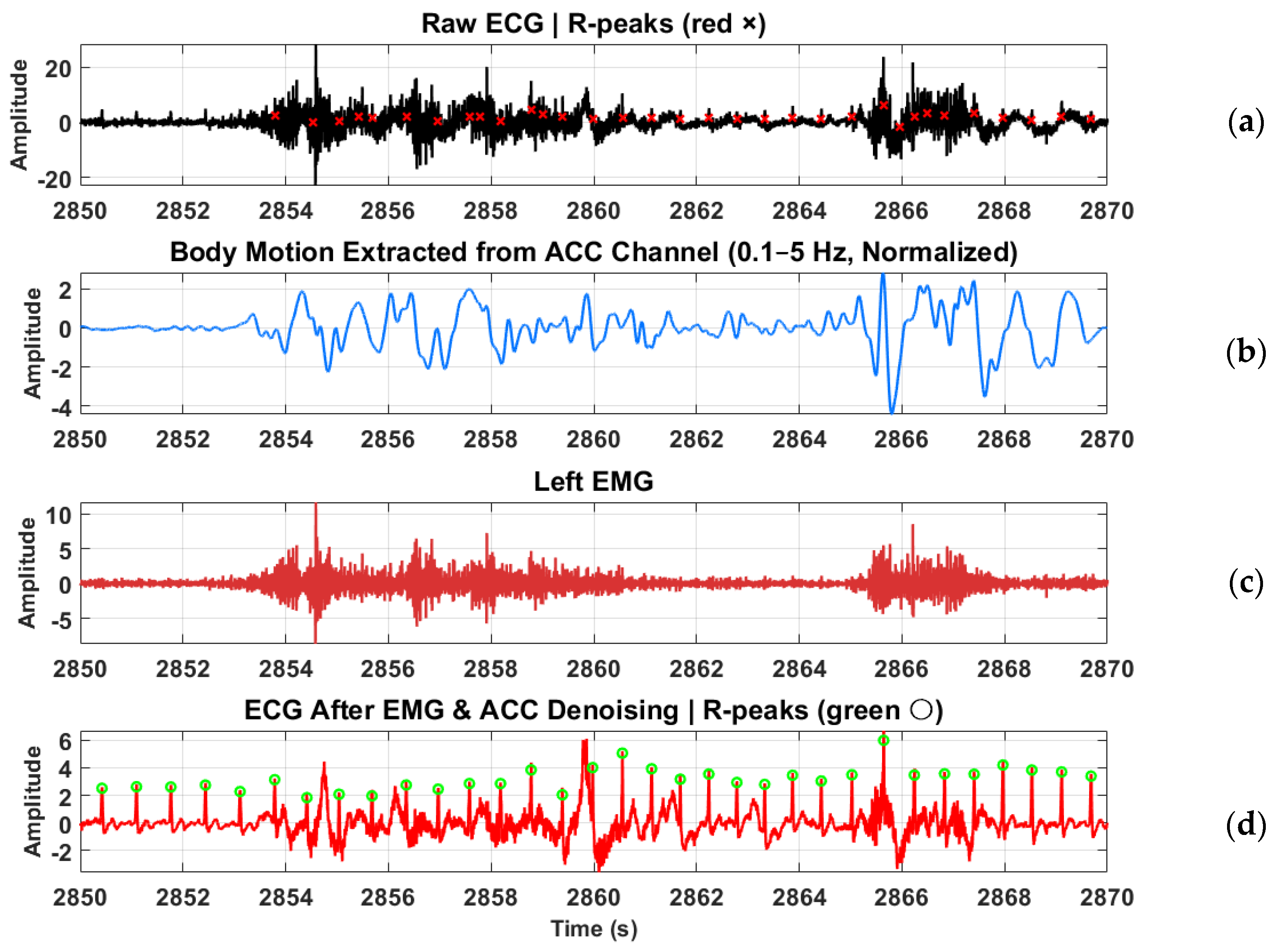 ECG signals were recorded continuously across all four protocol stages. HRV indices were computed for the Stroop and Head-Up Tilt (HUT) tests, where motion artifacts were minimal and clear R-wave morphology was preserved. For the Muscle Contraction and Simultaneous Stress tests, denoising was applied to remove the specific artifacts they exhibited, primarily motion and electromyographic (EMG) interference caused by voluntary and reflexive muscular contractions. To mitigate these artifacts, an adaptive denoising approach based on the Normalized Least Mean Squares (NLMS) algorithm was implemented. In this method, the filtered EMG channels (20–120 Hz) and the accelerometer (ACC) signal (0.1–5 Hz) were used as noise reference inputs. The adaptive filter iteratively estimated the correlated motion- and EMG-related components in the ECG and subtracted them from the primary signal in real time. To prevent morphological distortion of the QRS complexes, a QRS-gated adaptation scheme was employed, wherein the filter coefficients were frozen during R-peak intervals, ensuring that adaptation occurred only between beats. R-peaks were detected using a modified Pan–Tompkins algorithm applied to both the raw and denoised ECG signals. In the raw ECG, strong motion and muscle interference resulted in multiple false R-peak detections or missed beats. After applying the denoising procedure, the R-peaks were accurately localized, demonstrating the benefit of adaptive filtering under dynamic muscular conditions.