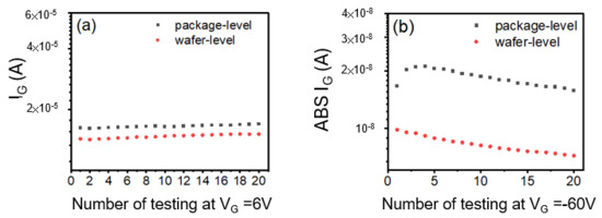 VG = 6 V and VG = −60 V pulse tests are performed 20 times in engineering samples in both wafer-level and package-level, then they are traced back for the correlation study of gate metal defect screening.