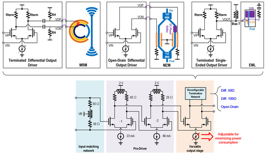 18. Yin, B.; Qi, N.; Shi, J.; Xiao, X.; Chen, D.; Li, M.; Li, Z.; Du, J.; He, Z.; Bai, R.; et al. A 32 Gb/s-NRZ, 15GBaud/s-PAM4 DFB laser driver with active back-termination in 65 nm CMOS. In Proceedings of the 2017 IEEE Radio Frequency Integrated Circuits Symposium (RFIC), Honolulu, HI, USA, 4–6 June 2017; pp. 264–267. [Google Scholar] [CrossRef]