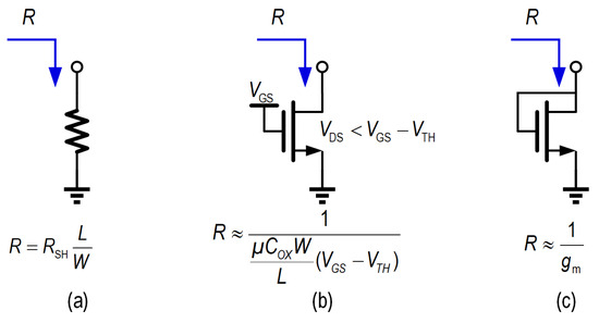 Figure 4. Components for passive back termination: (a) Resistor; (b) Linear-region MOSFET; (c) Diode-connected MOSFET.