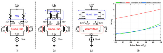 Figure 5. Schematic of the 6-dB-gain amplifier with different types of loads: (a) Diffused resistor; (b) Linear-region MOSFET; (c) Diode-connected MOSFET; (d) their simulated THD versus output swing.