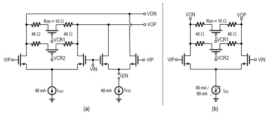 Additionally, the tail current I S S 1 and I S S 3 need to be set proportionally based on the desired output impedance Z 0 and the feedback resistors R FB , as shown in the following Equation (5).This configuration maintains constant gate voltages for transistors MN5 and MN6, enabling high driving efficiency. The driving efficiency η can be calculated using Equation (6).