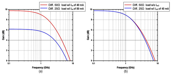 From Equation (2), modifying the terminal resistances without compensatory circuit adjustments inherently affects both the output swing amplitude and voltage gain characteristics. To address this, we can maintain a consistent swing by modifying the tail current I SS , as demonstrated in Figure 6b. By scaling I SS proportionally with R L variations, we maintain constant swing amplitude. Nevertheless, adjusting the tail current I SS alone does not keep the consistent gain, as shown in Figure 7a. If the same gain is required to avoid imposing higher swing requirements on the signal source, additional gain must be introduced at the pre-driver stage. This approach, however, not only increases system complexity and undermines low-power operation, but also further constrains the maximum achievable bandwidth of the entire driver.