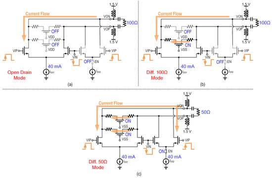 Figure 8. Switch status of different modes of the versatile output stage with PBT: (a) open-drain mode; (b) differential 100- Ω mode; (c) differential 50- Ω mode.