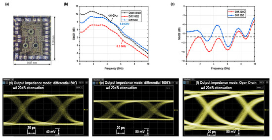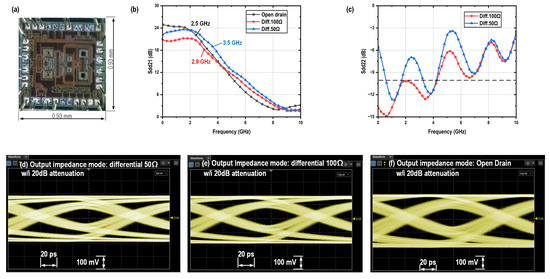 Figure 14. (a) Micro photograph of the ABT based VOD and its measurement results: (b,c) S parameters and (df) eye diagrams.