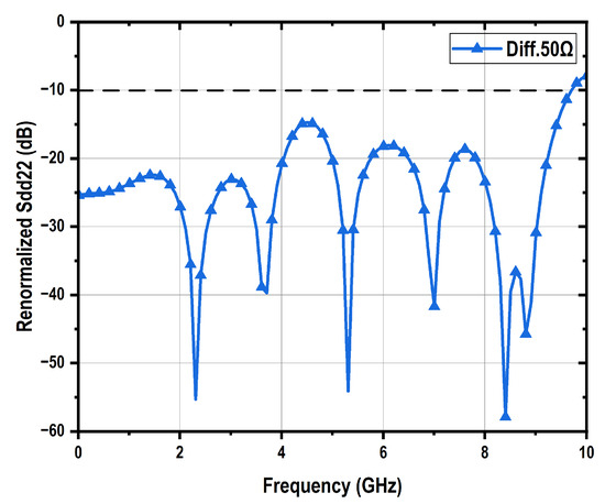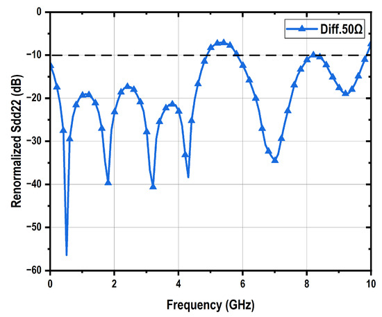 The performance of the driver with PBT is demonstrated in Figure 9. The open-drain mode presents the lowest bandwidth of 4.6 GHz, which is caused by its highest total load impedance, while delivering the largest differential peak-to-peak output swing of 3 Vppd with a input swing of 800 mVppd and a power consumption of 180 mW. The differential 50- Ω mode exhibits approximately 3 dB higher gain than the differential 100- Ω mode. This difference arises because the vector network analyzer (VNA) presents a differential 100- Ω load for the driver, rather than a differential 50- Ω termination. In terms of output swing, the 50- Ω mode reaches 2.0 Vppd, compared to 1.5 Vppd for the 100- Ω mode. Additionally, the 50- Ω mode consumes 240 mW of power, whereas the 100- Ω mode consumes 180 mW. The originally measured differential to differential S22 parameters under the VNA’s differential 100- Ω loading condition are shown in Figure 9c for both the differential 50- Ω and 100- Ω modes, with the results consistent with their respective output impedance characteristics. The 100- Ω mode demonstrates good impedance matching, achieving a return loss better than 10 dB across a 7-GHz bandwidth. The differential-to-differential output return loss scattering parameter S22 of the 50- Ω mode under a 50- Ω differential load can be renormalized using Equation (3), as illustrated in Figure 10, which also demonstrates good impedance matching.
