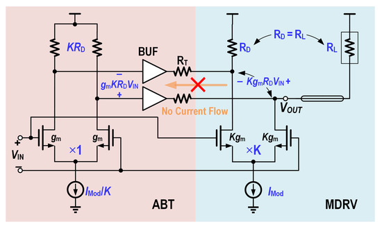 An ABT circuit comprising: A reduced tail current amplifier ( I mod / K ); Raised resistive loads ( K R D ) to maintain equivalent voltage swing; And a low-output-impedance buffer (BUF) with termination resistor R T .