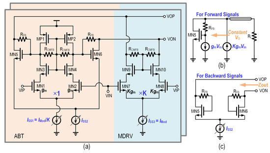 Figure 12. (a) Schematics of the reconfigurable output stage with ABT and its equivalent half circuit for (b) forward and (c) backward signals.