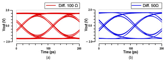 Figure 13. Simulated results of eye diagrams of the ABT based VOD: (a) differential 100- Ω mode; (b) differential 50- Ω mode.