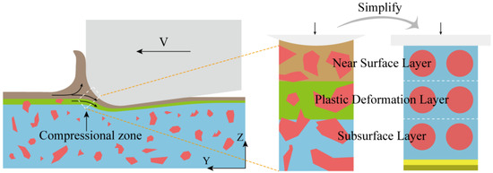The MD model was constructed based on the following simplifying assumptions: (1) both the Al matrix and Si particles are represented as single-crystal phases; (2) Si particles are modeled as spheres with uniform spacing within the matrix; (3) the local loading condition is simplified to plane normal pressure applied by a rigid indenter; and (4) the computational domain is partitioned into surface, subsurface, and matrix layers according to particle depth. The maximum compression depth was confined to the surface layer, enabling analysis of the mechanical response in each stratified region under different processing modes to investigate ploughing–extrusion damage dominated by the cutting-edge arc during micro-turning.
