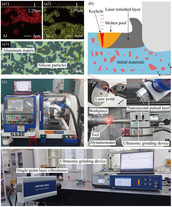 Laser-remelting ultrasonic-vibration turning setup: (a1) Subsurface Al distribution after remelting and cooling; (a2) Subsurface Si distribution after remelting and cooling; (a3) Original microstructure of the high-silicon aluminum alloy; (b) Schematic of the composite-field process; (c) CNC machining system; (d) Machining device and turning details; (e) Vibration performance test of ultrasonic device.