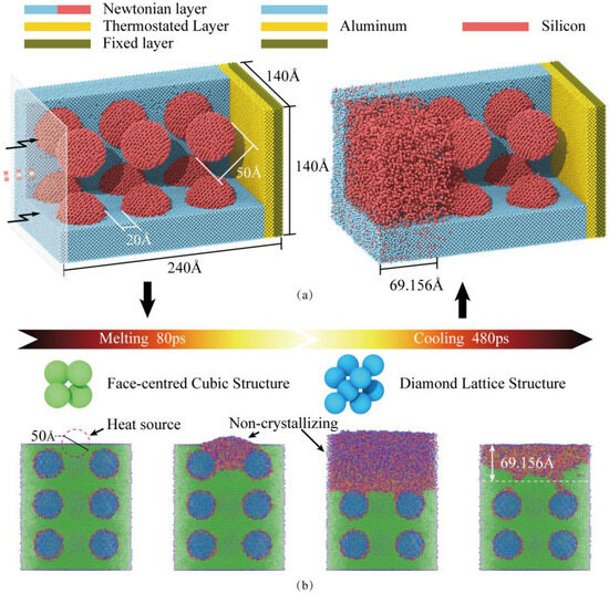 The resulting MD model is illustrated in Figure 3. Simulations were performed using the Large-scale Atomic/Molecular Massively Parallel Simulator (LAMMPS, 2Aug2023-MSMPI), with post-processing conducted in the Open Visualization Tool (OVITO, 3.14.1). The simulation box measures 140 Å × 240 Å × 140 Å and is partitioned along the thickness direction into a Newtonian layer, a thermostat layer, and a fixed boundary layer. The model incorporates twelve spherical Si particles (50 Å diameter, 20 Å nearest-neighbor spacing) uniformly distributed within the Al matrix, totaling 244,246 Al atoms and 39,319 Si atoms (283,565 atoms total), as presented in the left panel of Figure 3a.