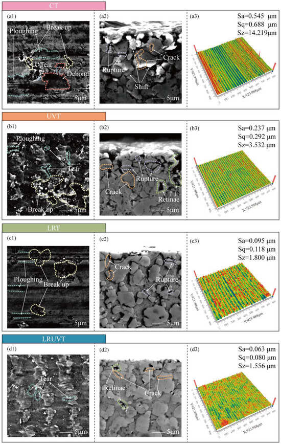 Surface and subsurface integrity under four machining modes: (a) CT; (b) UVT; (c) LRT; (d) LRUVT. Panels (a1–d1) show SEM surface micrographs; (a2–d2) show SEM subsurface micrographs; (a3–d3) show Zygo surface topography image.