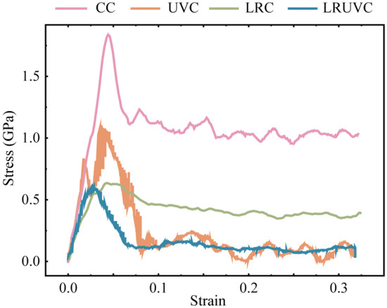 The overall mechanical response under each processing mode was compared through the calculated stress–strain curves presented in Figure 5. Conventional compression (CC) exhibits the highest yield peak stress, followed by a high early-stage flow stress plateau with irregular fluctuations, consistent with continuous loading and pronounced work hardening. In ultrasonic vibration compression (UVC), the stress reaches an initial peak before rapidly decreasing to a lower, periodically oscillating level, characteristic of intermittent loading and demonstrating significant acoustic softening [33]. Laser-remelting compression (LRC) shows substantially reduced peak and steady-state flow stresses compared to CC. The stress attenuates gradually during compression, maintaining a moderate level with limited work hardening and no distinct yield point phenomenon. Laser-remelting ultrasonic-vibration compression (LRUVC) displays the lowest initial peak stress, which then rapidly decays to the minimum sustained stress level with only minor oscillations. Collectively, both laser remelting and ultrasonic vibration effectively reduce peak and average stress, with the LRUVC mode providing the most pronounced and stable suppression of both stress magnitude and fluctuations.
