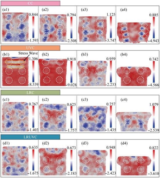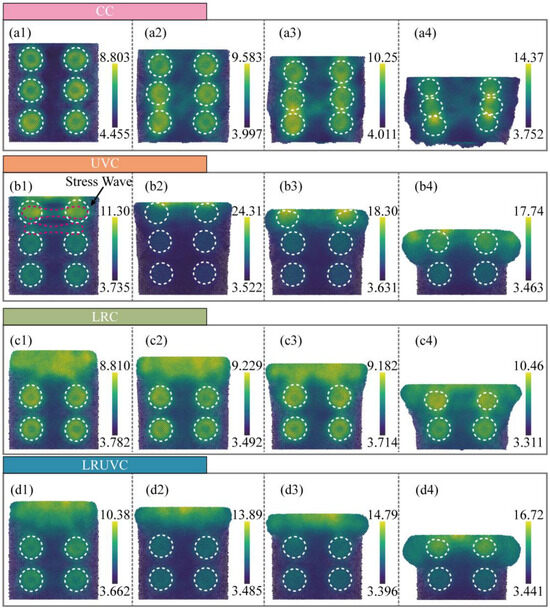 The LRUVC exhibits a transitional response, evolving from a remelting-dominated to an ultrasonic-dominated state. At the initial compression stage (Figure 6(d1)), the overall stress distribution closely resembles that of LRC (cf. Figure 6(c1)), with concentrations within the remelted layer and bottom particles. The superimposed ultrasonic energy elevates the stress magnitude slightly above pure LRC levels, although it remains substantially lower than in UVC. During the early to middle compression stages (Figure 6(d2,d3)), the stress magnitude experiences a moderate increase. The system undergoes a rapid transition from the initial remelting-dominated regime to a state exhibiting ultrasonic-vibration characteristics, achieving this shift more rapidly than in pure UVC. Crucially, the hybrid mode eliminates the pronounced early stress peak and deep stress wave propagation characteristic of UVC—phenomena that pose practical risks by potentially activating pre-existing defects. Instead, LRUVC maintains a moderated initial response while directly accessing the more stable mid-to-late-stage deformation behavior of UVC. By the final compression stage (Figure 6(d4)), load-bearing transitions predominantly to the underlying unremelted layer. The resulting stress distribution pattern resembles that of UVC but exhibits a moderately reduced magnitude compared to pure UVC (cf. Figure 6(b4)). With continued compression, the response would converge completely toward the characteristic UVC state.