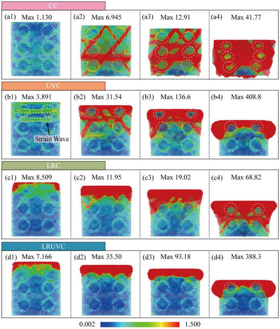 In LRUVC, EPS reflects the synergy between remelting and ultrasonic vibration. At the initial stage (Figure 8(d1)), the strain level is high and the distribution reaches slightly deeper than in LRC. Yet, the concentration still lies near the top of the remelted layer and around the first particle layer, indicating that the remelted layer effectively weakens the near-surface concentration caused by ultrasonic impact. In the early and middle stages (Figure 8(d2,d3)), EPS rises rapidly and the affected region expands. However, the growth rate is lower than in UVC because of the remelted layer. And the depth of the ultrasonic concentration effect is smaller than in LRC, demonstrating the complementary advantages of the hybrid field. This ability to hold a more stable strain within a smaller region combines efficiency with stability. At the end stage (Figure 8(d4)), the overall pattern approaches UVC. The peak is slightly lower. The edge localization is milder. And the end-stage failure seen in LRC does not appear. Overall, the hybrid mode couples the strengths of both fields and controls both strain intensity and penetration depth throughout loading, highlighting the dual benefits of fast effectiveness and process stability in LRUVC.