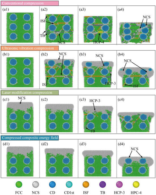 To probe the microscopic slip mechanisms during compression, the Crystal-Analysis-Tool (CAT) was used to identify and count defects. Figure 9 shows the evolution of the defect distributions. In CC, the workpiece with only a few defects at interfaces is mainly face-centered cubic (FCC) in the early stage (Figure 9(a1)). At the next stage (Figure 9(a2)), stacking faults grow rapidly along slip planes and interfaces. And twins appear in high-strain zones, indicating slip activation. At the middle stage (Figure 9(a3)), defects increase further, and local body-centered cubic (BCC) regions emerge. Multiple defect types form an interwoven network, showing entry into a severe plastic-flow regime. At the end stage (Figure 9(a4)), defects spread across the workpiece. SFs and twins extend over large areas. And overall crystal integrity is seriously degraded.
