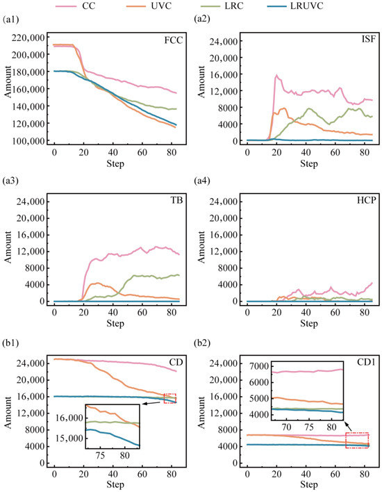 To clarify defect evolution with increasing compression, Python (3.11.5) was used to extract counts of the relevant defect types and diamond structures. And plotted the results in Figure 10. In Figure 10(a1), the fraction of FCC decreases rapidly at the early stage of compression. The CC and UVC have the fastest drop. By contrast, the remelted layer preferentially bears the load in LRC and LRUVC. So, FCC weakening is more moderate. In Figure 10(a2), intrinsic stacking fault (ISF) counts rise quickly in CC and UVC. Then it declines after reaching a peak, indicating that part of the ISF population transforms into an amorphous phase. Figure 10(a3) shows that the twin boundary (TB) increases markedly and then decays in UVC. It is a trend consistent with the ISF-to-amorphous transition. In CC, however, TB continues to grow after an early rapid rise, indicating delayed weakening. The behavior also appears in LRC. Though it is milder. Figure 10(a4) indicates that HCP accumulates gradually in CC and LRC. While it appears mainly at the mid-stage in UVC. It signals the highly unstable plastic state there. Across these three defect types (ISF, TB, HCP), LRUVC shows very low levels, underscoring the strong defect-control capability of the composite energy field.