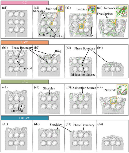 In LRUVC, defect evolution reflects the coupling of the two mechanisms. Throughout loading (Figure 9(d1–d4)), crystal integrity remains very high outside the remelted layer. The strong localization of the high-strain zone keeps structural damage confined. Lattice collapse occurs mainly within this zone. And only a small number of defects form and propagate downward. Although this ideal behavior is partly related to the single-crystal modeling simplification, it still demonstrates the clear advantage of the composite energy field in damage control. This phenomenon was also verified in the wear resistance experiment of Fu et al. [35].