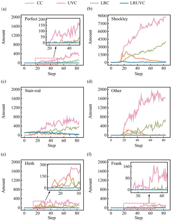 In CC, counts for nearly all dislocation types are highest. The rapid proliferation of dislocations builds a dense network, raising local stress via work hardening. Once interlocking and pinning are overcome, the lengths of different types surge together with strong fluctuations, making this mode the least stable. In UVC, early dislocation nucleation increases. But cyclic loading promotes cross-slip, recovery, and annihilation, which reduce the net build-up of perfect and Shockley segments and shorten the lifetime of stair-rod locks. Consequently, Shockley and stair-rod lengths show a first-increase-then-decrease trend from the mid stage onward. In LRC, stress redistribution by the remelted layer lowers the migration barrier, delaying interlocking in stages. As compression deepens and the remelted layer weakens, its redistribution ability declines, and the accumulation pattern drifts toward CC. A noticeable early population of stair-rod segments in LRC and LRUVC suggests that thermal stress from remelting in the unmelted zone can induce corresponding reaction dislocations.