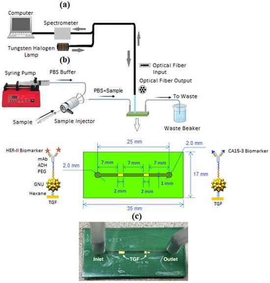 Biosensors are characterized by their high sensitivity and selectivity, portability, compact design, minimal sample requirements, low signal-to-noise ratios, and capability for remote sensing applications []. Immunosensors, in particular, are distinguished by the specificity of antigen–antibody interactions, positioning them as promising candidates for the development of POC diagnostic platforms. These systems offer several advantages, including full automation, rapid response times, cost-effectiveness, high sensitivity, portability, and robust precision and accuracy [,]. Unlike conventional immunoassays, label-free (or direct) immunosensors can detect chemical or physical changes resulting directly from antigen–antibody interactions without the need for labelling agents. For effective early cancer detection, however, it remains critical to accurately identify and rapidly quantify cancer-specific biomarkers. Microfluidic technology plays a key role in this context by enabling precise control of fluid dynamics at the microscale within integrated, miniaturized POC devices. This facilitates rapid analyte mixing and reaction, thereby significantly enhancing the sensitivity and selectivity of biosensors [,,]. Consequently, microfluidic chips have emerged as cost-effective alternatives to conventional diagnostic methods, offering advantages such as reduced sample volume, rapid analysis, seamless integration, portability, and suitability for on-site testing [].