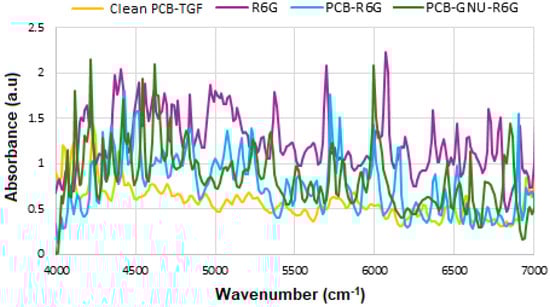 When comparing the R6G, PCB-R6G and PCB-GNU-R6G absorbance spectra in Figure 3, there were four regions where peaks from all three spectra are overlapped, albeit slightly shifted. Those regions were ~5300 cm−1, ~5700 cm−1 and ~6000 and ~6700 cm−1. These peaks may be tentatively attributed to R6G, and be used for the enhancement factor calculations. The results are summarized in Table 2.