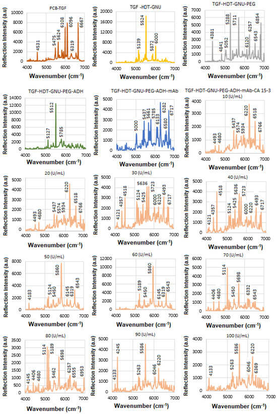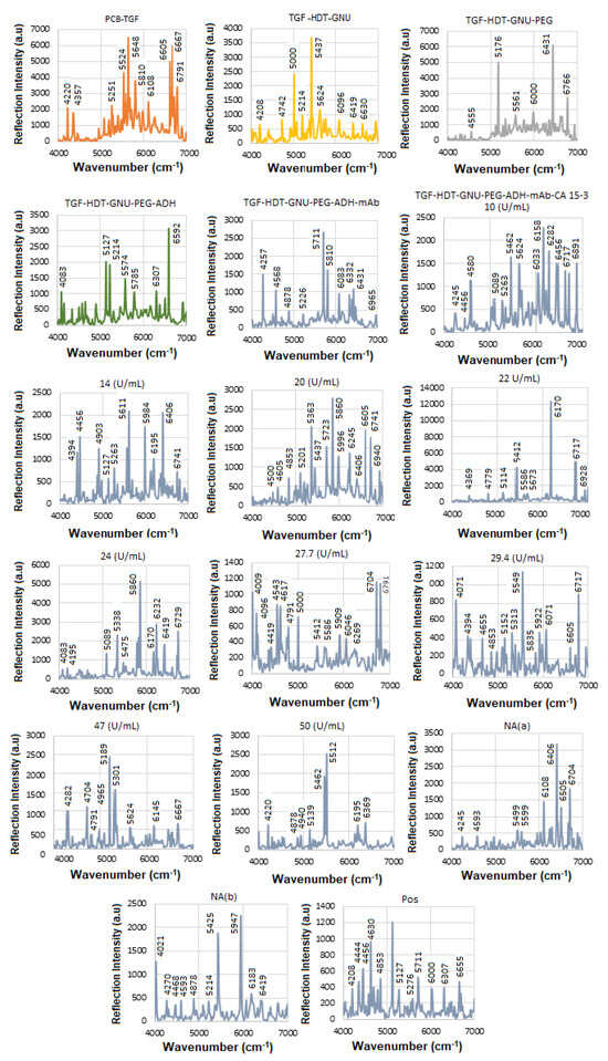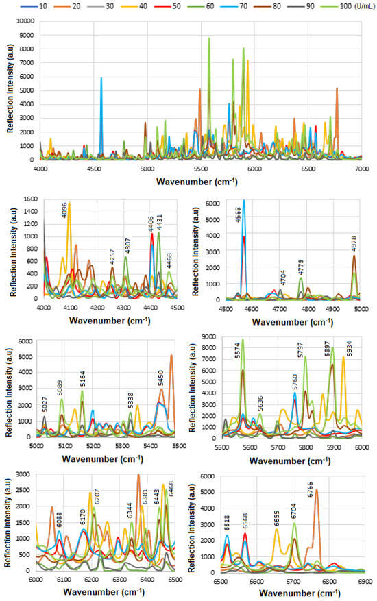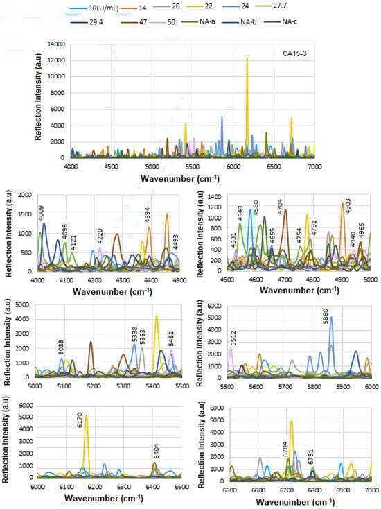 Figure 9 shows the results of the SE-FTIR for the standard CA15-3 biomarker using various concentrations. This biomarker is derived from MUC1 mucin, a large glycoprotein with a high molecular weight. In the range 4000–7000 cm−1, it is often considered as near-IR overtones or combination bands. The vibrational modes between ≈ 3200–3600 cm−1 are associated with O-H stretch and ≈3300 cm−1 to N-H stretch (amide A), between ≈ 2800–3000 cm−1 to C-H stretch (aliphatic). The overtone or combinations are expected to occur around 6600–7200 cm−1, and the 1st overtone about 5800–6000 cm−1. The combination bands are somewhat above these values. There are some similarities between the proteins or glycoproteins, so both will show overtone/combination bands of N–H, O–H, C–H, etc. They have both overtones, including first overtones of O–H (around 7000–5500 cm−1), N–H, and possibly combination bands involving CH stretching/bending. Thus, there should be overlapping peaks in many of those regions. In both types of samples, water (free and bound) will contribute to those higher energy overtone regions, O–H overtones often interfere/overlap. At high enough concentration, both biomarkers will produce an overtone signal and overlapping peaks. However, some possible differences should be considered, such as glycosylation (more or different sugar moieties in CA15-3), and possibly different secondary structure content (α-helix vs. β-sheet) might shift relative intensities of overtones/combinations. Also, different levels of bound water and differences in the sample environment could alter O–H/N–H combination bands. Intensities might differ as CA15-3’s glycan parts may have more O–H from sugars, and HER-II (extracellular domain) may have a different hydrophobic/hydrophilic balance. They could have different shapes or widths of bands in ~6000–7000 cm−1 due to the degree of exposure of hydrophilic groups. Finally, the differences in concentration in biofluids may make one more detectable; as such, CA15-3 is often more abundant or used more in monitoring, while HER-II exodomain shedding may be at a lower concentration. Therefore, HER-II overtone bands might be weaker or noisier [].