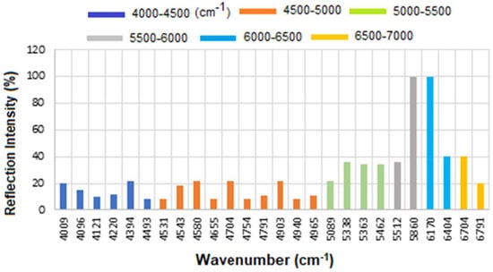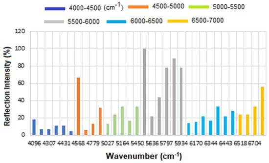The corresponding results are presented as a histogram in Figure 7 to enhance the visualization of regions with varying reflectance. The region between 4000 and 4500 cm−1 has the lowest reflectance, i.e., highest absorption, mainly related to CH2 and CH combination/overtone bands. The region from 6000 to 7000 cm−1 represents the next highest absorption band, associated with overtones indicative of protein secondary structures, RNH2 and OH first overtone features, and broad combination bands from CH groups.
