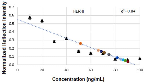 Figure 8a displays the stacked SE-FTIR spectra of standard HER-II solutions at concentrations ranging from 10 to 100 ng/mL. The strip regions between 5400 and 5500, 6400 and 6430, and 6700 and 6800 cm−1 are likely related to the overtone or combinations, OH first stretch overtones (especially of glucose), aromatic CH first overtone, and CH2 combination overtones. These values are used to construct the calibration curve. As the HER-II concentration increases, the intensity of reflection decreases linearly, making this region particularly suitable for quantitative analysis. Figure 8b presents the calibration curve, generated by plotting the SE-FTIR signal intensities of the characteristic RNH2 and OH first overtone features against their corresponding HER-II concentrations. The slopes of the curves for each region were found to be 0.11, 0.34, and 0.80, respectively. Among these, the slope of R2 = 0.80 was selected as the optimal value, representing the sensitivity of the SE-FTIR immunoassay. It is important to note that while individual FTIR spectra reveal the molecular composition at specific sample points, they may not reflect the broader sample due to the lack of spectral averaging. Nonetheless, the consistent linear decrease in reflection signal intensity across concentrations confirms the sensor substrate’s uniformity and tentative, reliable response behaviour throughout the experiment.