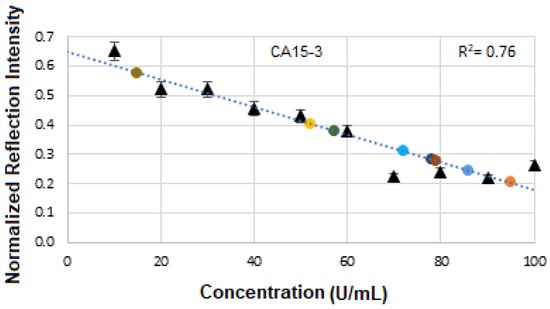 Variation in normalized intensity with BCS CA15-3 concentrations from the calibration curve based on experimental data used to quantify the unknown sample.