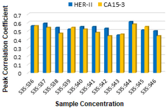 Comparison of correlation coefficient variation with the sample concentration for both HER-II and CA15-3 biomarkers.