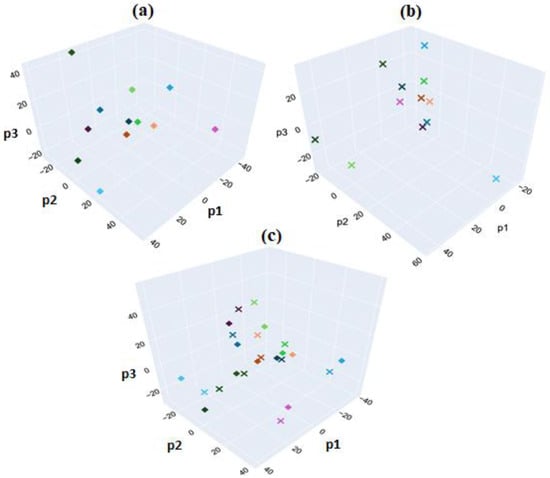PCA discrimination of (a) HER-II, (b) CA15-3, and (c) combined samples. The diamonds represent HER-II samples, while crosses represent CA15-3 samples. Each colour represents a unique patient.