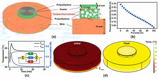 Although repeated heating–cooling cycles were not explicitly simulated, the stable temperature convergence within ±0.037 °C under PID control indicates strong intrinsic thermal stability of the proposed ZHF system. These findings establish microporous insulation as an effective strategy for achieving low-power, wearable ZHF thermometry, enabling extended operational lifetime in battery-driven and wireless health monitoring platforms. Future studies will focus on experimental validation, cyclic stability evaluation, and integration with flexible electronic architectures to translate these design insights into practical biomedical applications.