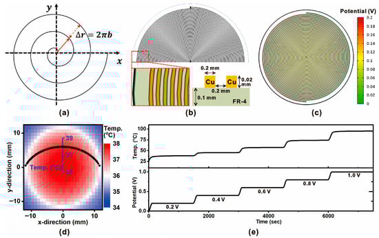 Figure 2 illustrates the design principle, structural configuration, and thermal–electrical performance of the spiral resistive heater integrated into the ZHF thermometry probe. As shown in Figure 2a, the heater adopts an Archimedean spiral geometry, where the incremental radial distance (Δr) between adjacent traces is defined by the relation Δr = 2πb, ensuring continuous spacing along the spiral path. This configuration maximizes the effective heating area while maintaining compact dimensions, allowing localized and efficient energy delivery to the skin-contact surface. A cross-sectional schematic of the heater fabrication is presented in Figure 2b. The heater consists of copper traces deposited on an FR-4 substrate, with a thickness of 0.02 mm and trace spacing of 0.2 mm. This geometry follows established design practices for microheater structures on FR-4 substrates. Previous studies have reported copper foil thicknesses of 0.018–0.035 mm and conductor widths in the 0.1–0.2 mm range, which provide uniform heating performance, manufacturability, and mechanical stability in flexible and PCB-based microsystems [,,]. This layered structure provides both electrical conductivity for Joule heating and mechanical robustness for integration with polymer-based insulation. The simulated potential distribution under a 0.2 V bias is shown in Figure 2c. The potential gradient across the spiral is smooth, confirming uniform current density along the trace and minimizing localized hot spots. Such uniform electrical characteristics are essential for stable and predictable thermal output during closed-loop control. The thermal field generated by the spiral heater is shown in Figure 2d. The heater surface exhibits a nearly symmetric temperature distribution, with the central region reaching ~39 °C while the periphery remains slightly cooler. This uniformity ensures accurate maintenance of the ZHF condition at the probe–skin interface, a prerequisite for reliable deep-body temperature estimation. Finally, Figure 2e presents the transient thermal–electrical performance of the heater. Stepwise voltage inputs (0.2–1.0 V) result in proportional increments in surface temperature, confirming controllability and repeatability of the heating process. The temperature increases rapidly upon each voltage step and stabilizes within a few minutes, demonstrating the heater’s suitability for real-time PID-controlled ZHF applications.